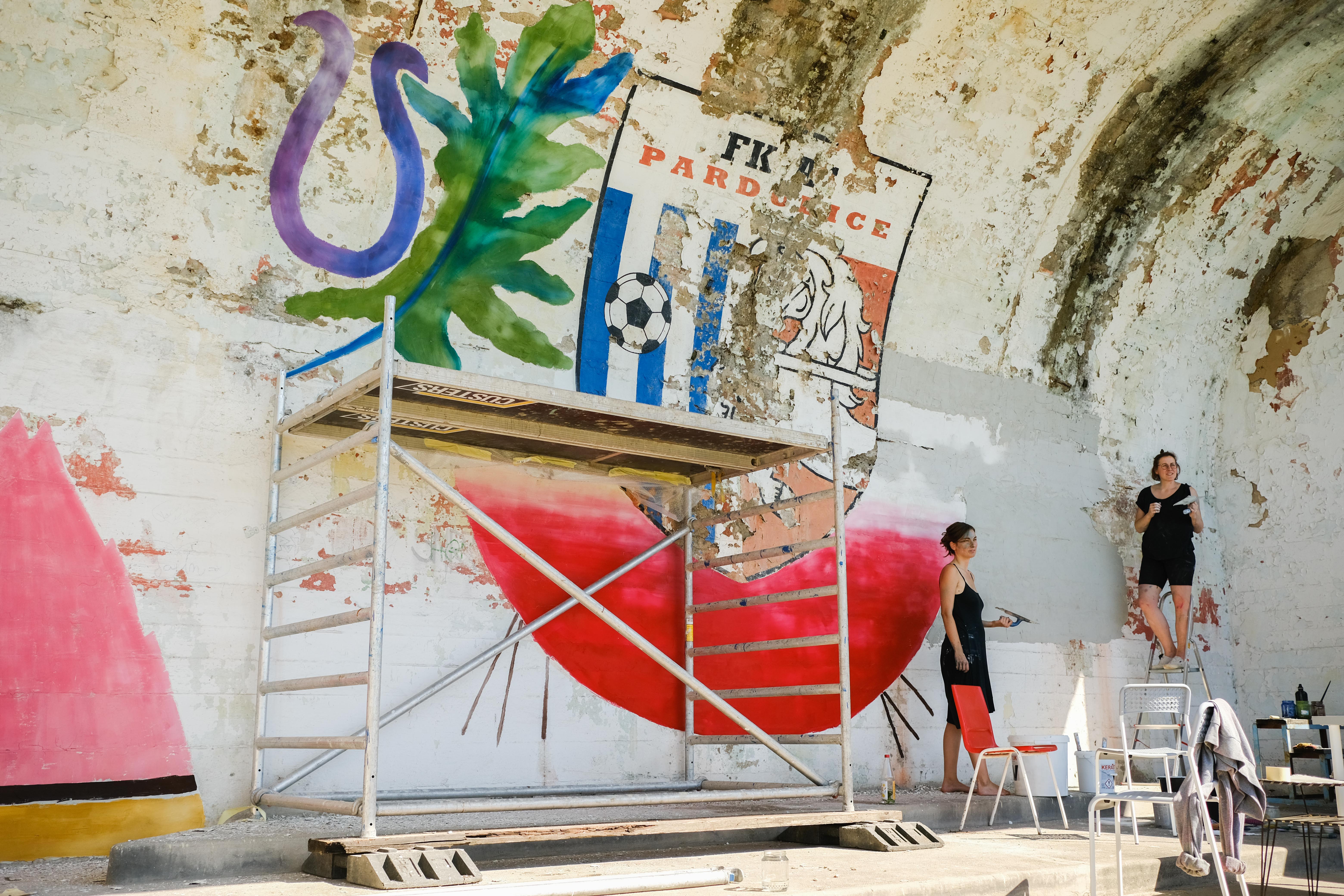 Na ploše betonové skořepiny střechy pódia Letního stadionu architektů Karla Řepy a Ferdinanda Potůčka, tzv. Brány borců vznikl dialog současného s minulostí. Svou autorskou malbou do mokré omítky jsme doplnily původní, zubem času značně degradovaný znak půlkoně s kopacím míčem a vytvořily tak imaginativní krajinu Pardubic.