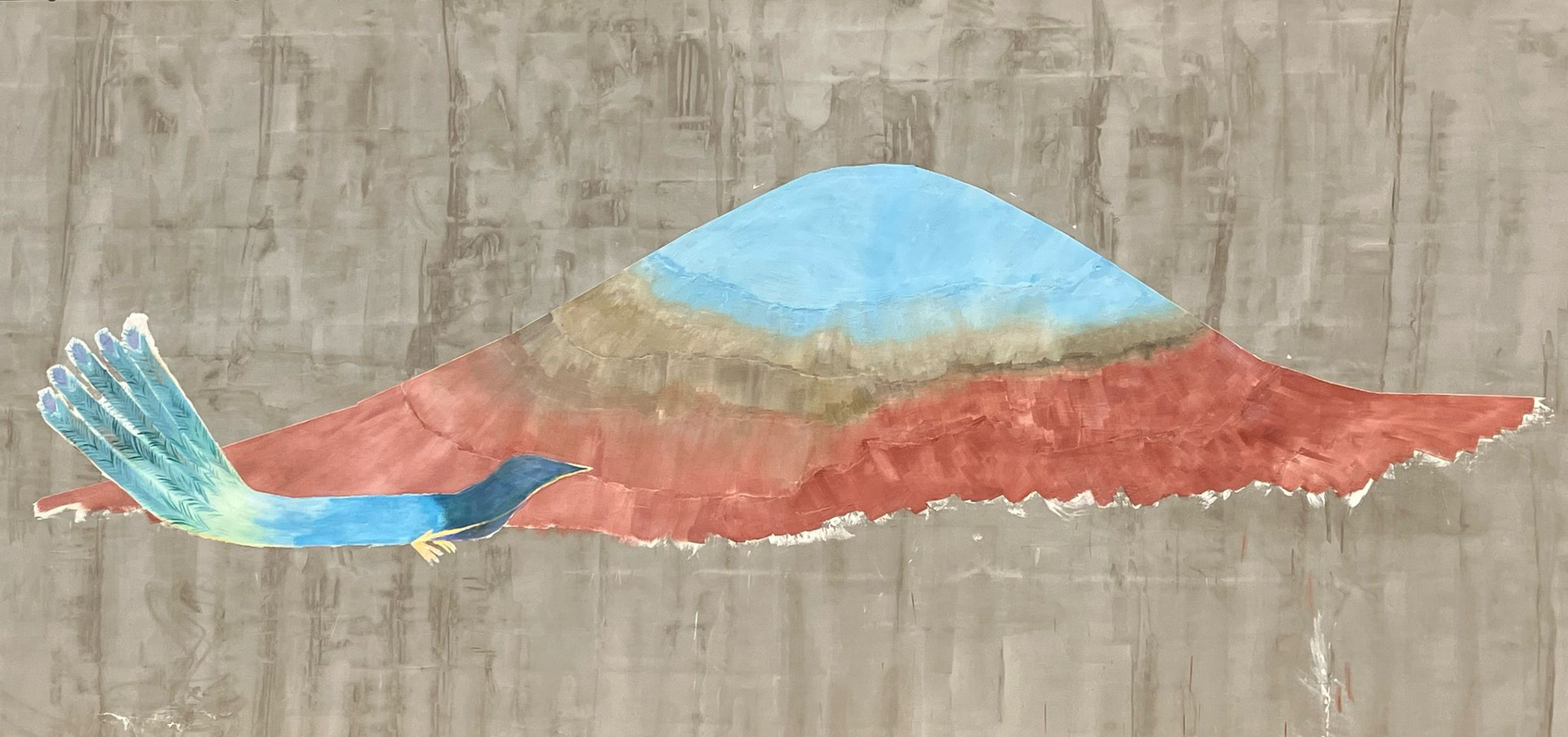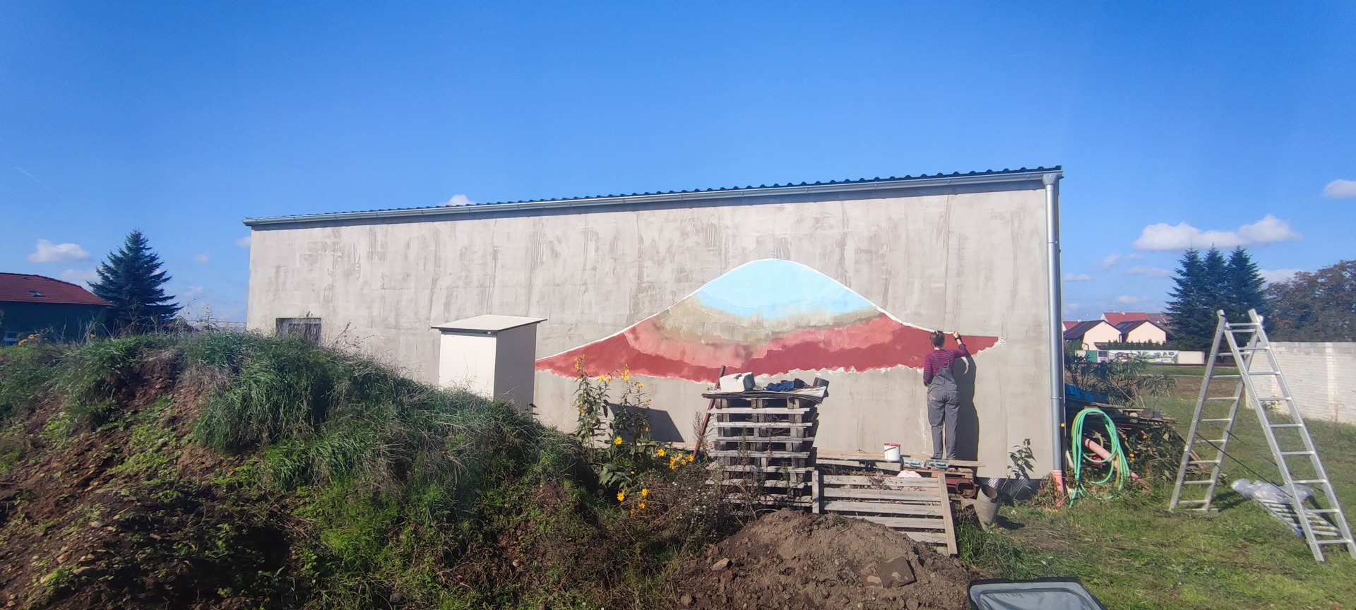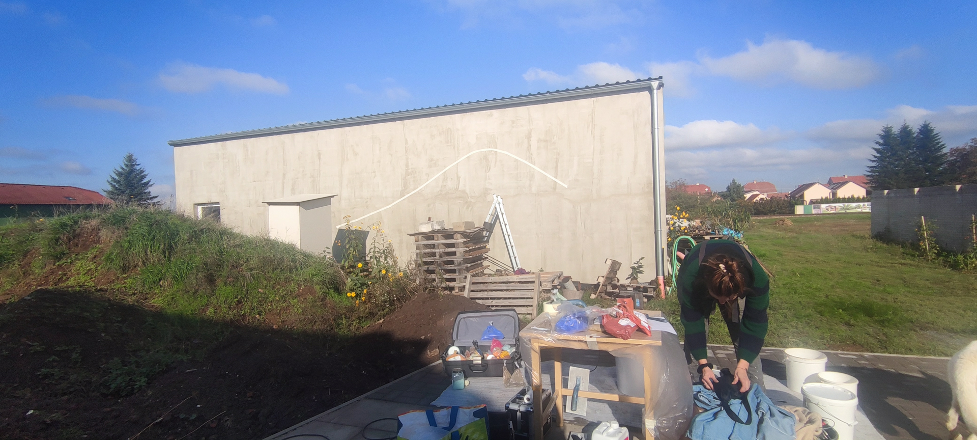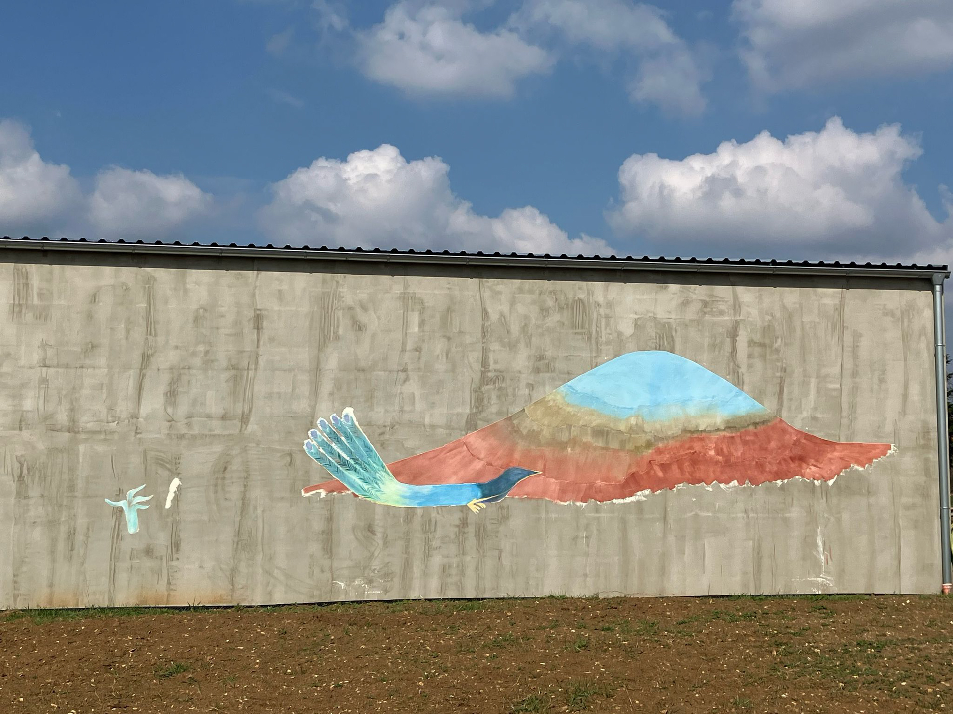 Zabydlování dostavěného domku vnuklo Laďce nápad, že by si přála dívat se na umění, které by ji rozradostňovalo při pohledu ven z oken. Vznikl nápad pojednat plochu zdi sousední švagrovy dílny a když i ten souhlasil, přijely jsme skicovat. Laďka se velkoryse věnuje místní kultuře- udržuje tradici lidových krojů a zpěvů, vede místní soubor a práce má nad hlavu. Jako inspiraci jsme dostaly k nahlídnutí několik motivů z místních lidových maleb a vzorů a zaujal nás obrazec stylizovaného páva. Paví péro si strážničtí muži dávali za klobouk, když šli na vojnu jako formu ochrany a památky na svůj domov. Páv teď střeží i domov Laďky.