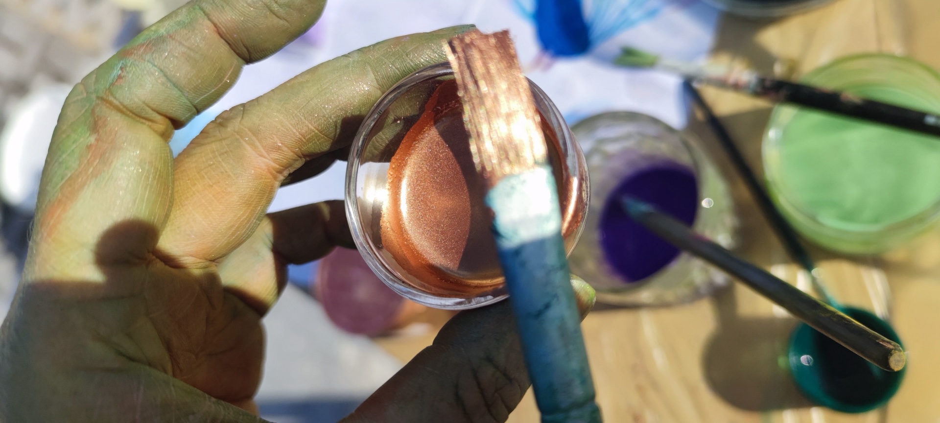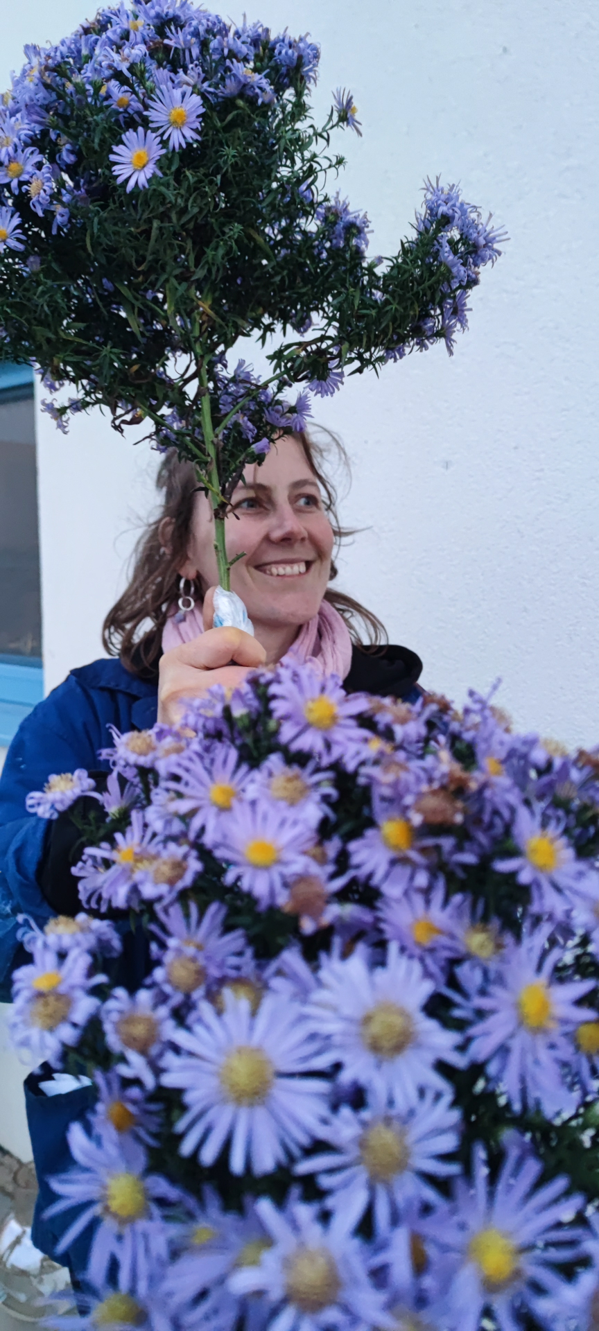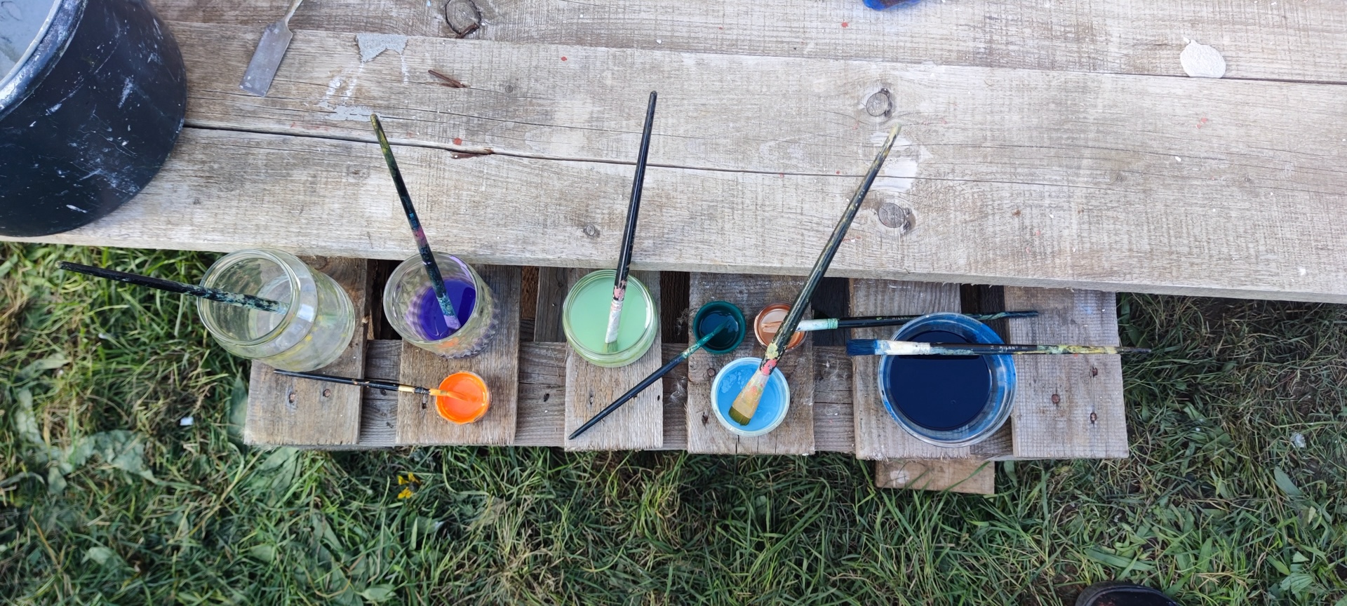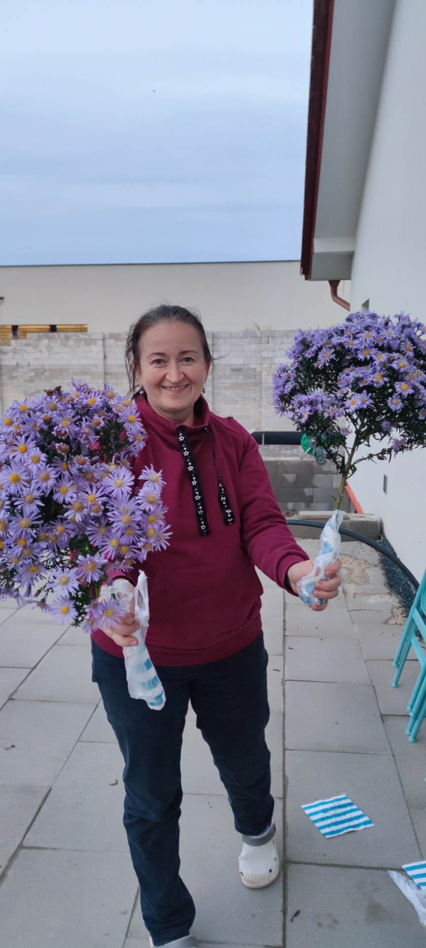 Zabydlování dostavěného domku vnuklo Laďce nápad, že by si přála dívat se na umění, které by ji rozradostňovalo při pohledu ven z oken. Vznikl nápad pojednat plochu zdi sousední švagrovy dílny a když i ten souhlasil, přijely jsme skicovat. Laďka se velkoryse věnuje místní kultuře- udržuje tradici lidových krojů a zpěvů, vede místní soubor a práce má nad hlavu. Jako inspiraci jsme dostaly k nahlídnutí několik motivů z místních lidových maleb a vzorů a zaujal nás obrazec stylizovaného páva. Paví péro si strážničtí muži dávali za klobouk, když šli na vojnu jako formu ochrany a památky na svůj domov. Páv teď střeží i domov Laďky.